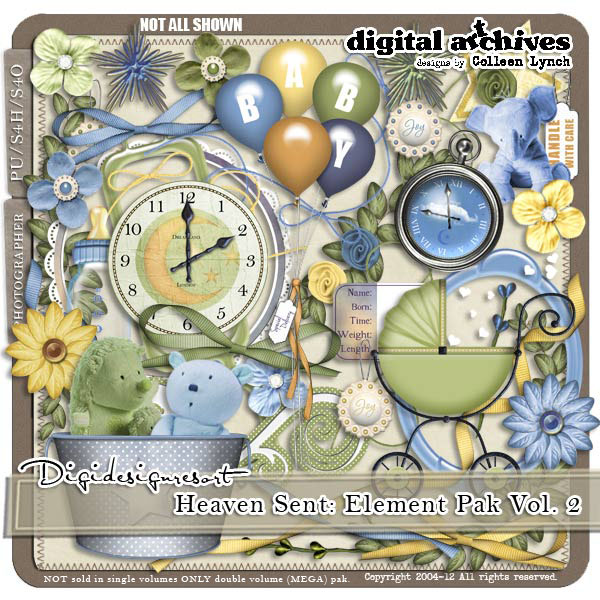 The Heaven Sent Collection includes: a MEGA Element Pak, a MEGA Paper Pak,a MEGA Embellished Words Pak and a MEGA Alpha Pak. As always these are available as individual MEGA packs or save 25% by purchasing the MEGA Complete Kit (includes Paper Pak and Element Pak) or save 35% by buying the MEGA Collection Pak (includes the MEGA Paper Pak, MEGA Element Pak, MEGA Embellished Words Pak and MEGA Alpha Pak). In addition you will find 2 Quick Cluster Frame Paks, and 2 Quick Paper Stack Paks to jump start your projects.This is Vol. 1 of the elements. It comes in a mega element pack and is not sold separately. You will pay only for Vol. 1... Vol. 2 is my gift to you! It's like getting 50% off retail the price!